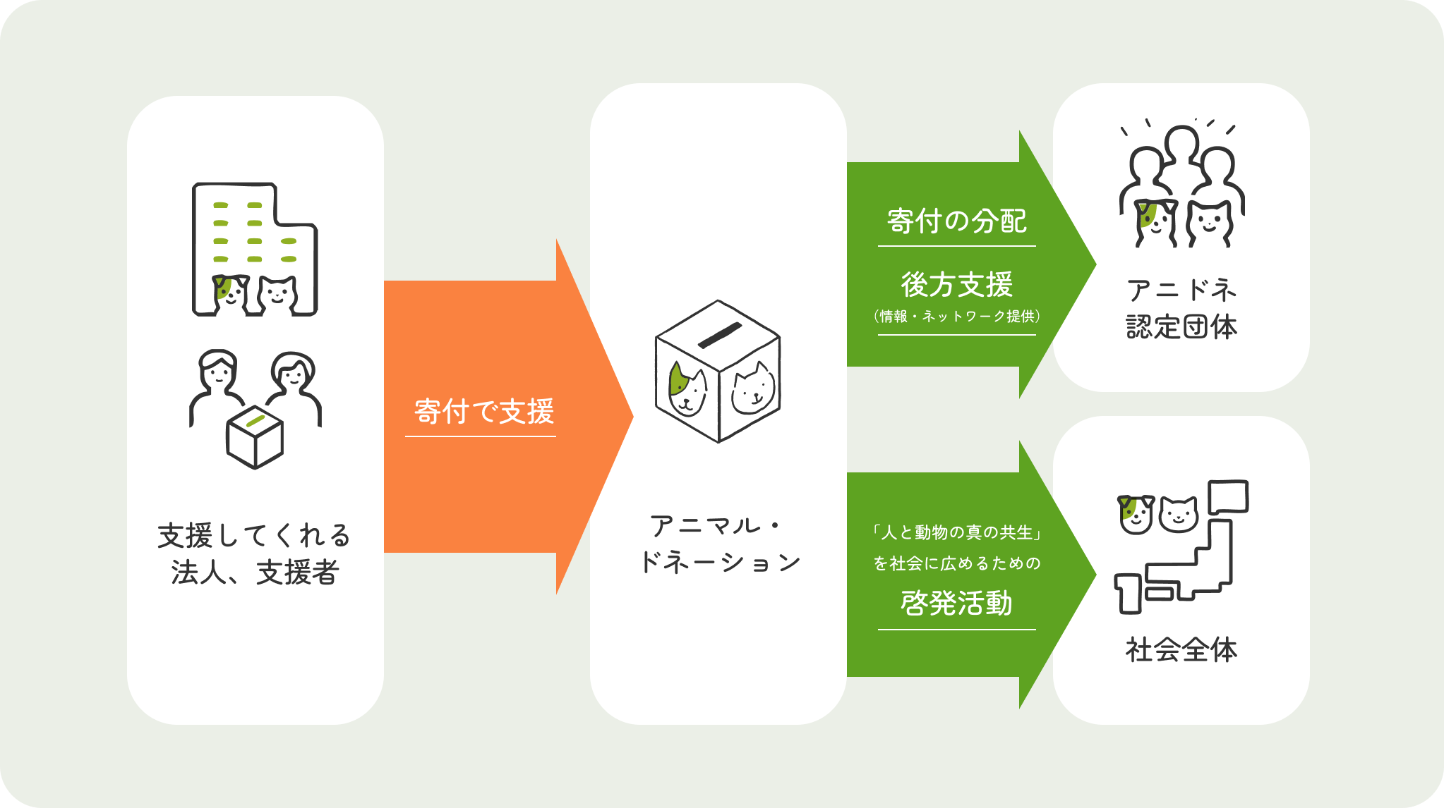 動物のために活動している団体はたくさんあります。しかし、「支援したい」というキモチがあっても、どこに寄付していいか分かりづらい側面も。中間支援組織であるアニドネは、誰もが納得でき、簡単に、安心して寄付ができる仕組みを整えています。