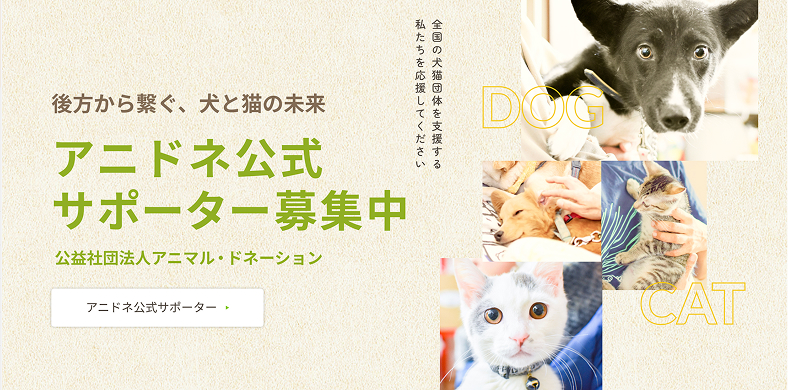 公益社団法人アニマル・ドネーションは、動物専門の寄付サイトを運営する中間支援組織です。動物福祉向上のためにがんばっている人(認定団体)と、支援したいキモチ(寄付)をつないでいます。ご寄付は53の認定団体に届け、その活動内容や資金の使い途まで見守っていきます。