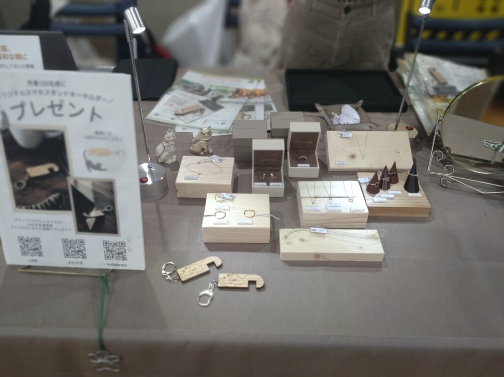 このブースでは、ニャンフェス先行販売のピアスキャッチ「マウヤール」とハロウィン限定のブラックダイヤモンドのリング「ミャゴラーレ」、過去にご好評だった猫耳の一粒ダイヤネックレス「パータ」などを展示されたそうです。