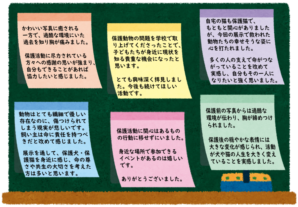 朋優学院では、今回の展示を通じて得られた反応を励みに、人と動物がともに幸せに暮らす社会について考える機会を、教育現場から継続的に発信していきたいと考えています。