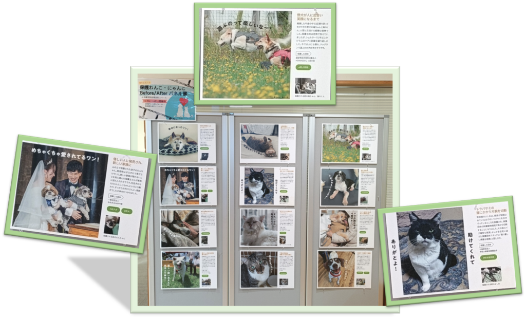 犬や猫が置かれている現状をより身近に感じてもらうことを目的に、保護に至るまでの経緯や、保護後の穏やかで幸せそうな姿を写真パネルで紹介。