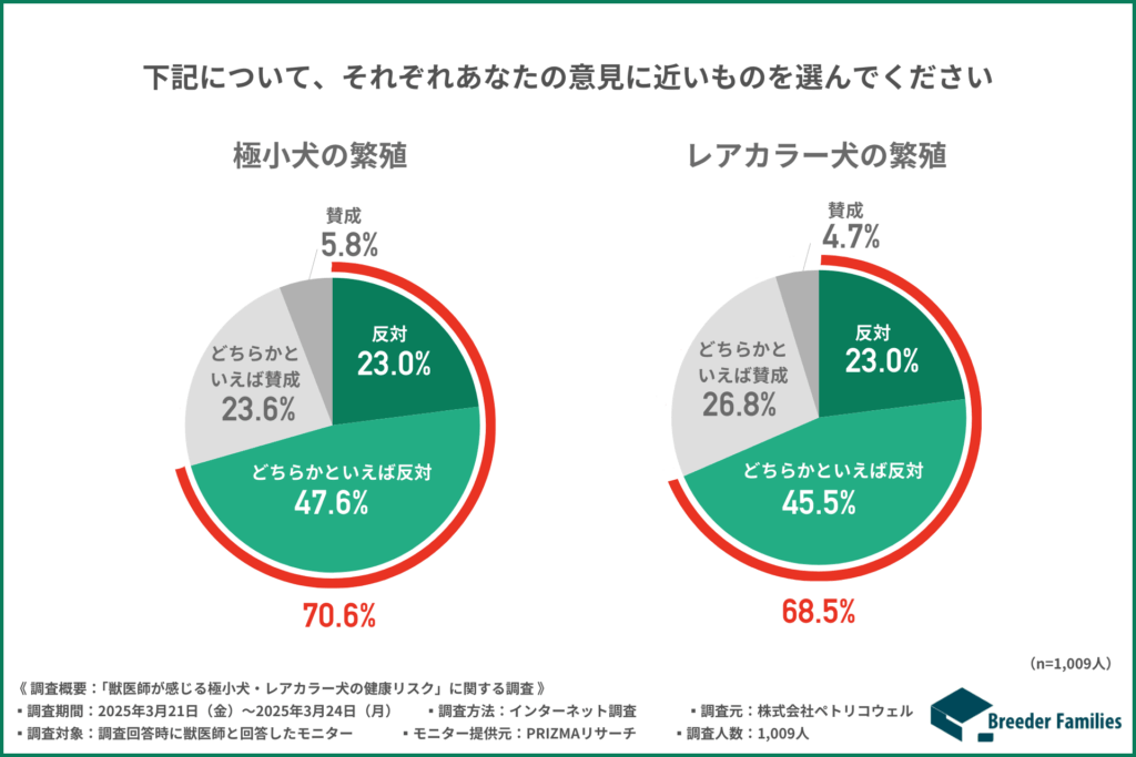 「優良ブリーダー」のみを厳選して紹介するマッチングサイト『Breeder Families』を運営する株式会社ペトリコウェルの調査によると、獣医師の約7割がレアカラーや極小犬、ミックスに反対しているいう結果も出ています1)2)。