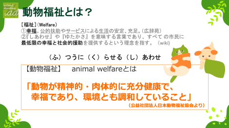 動物福祉とは、「動物が精神的・肉体的に健康で、幸福であり、環境と調和して生きられること」と定義されています。