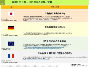 例えば、法律の中で動物はどう定義されているか、他国がどのような歴史的経緯を経て法律が整備されてきたか、現状の動物福祉面での違いはなにか、、、等