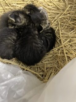 屋根のある物置の中、ビニール袋に入れられたきれいな藁の上で、ママ猫が子育てをしていました。目が開くか開かないかほどの、生後1週間ほどの小さな命が4匹。