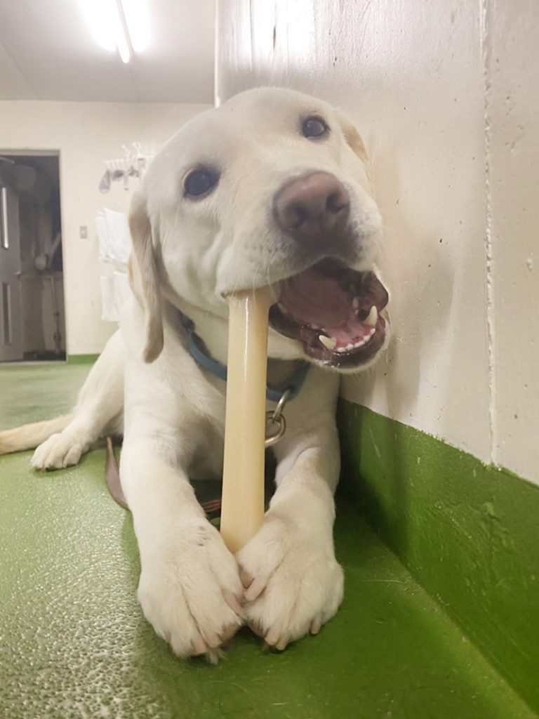 「入学後に東日本盲導犬協会の犬舎で過ごす訓練犬は、常に約20頭前後います。約1年間の訓練生活を送りますが、この期間は健康維持を考慮された1日2回のフードのみとなります。噛む力の強いラブラドールにナイラボーンはオススメで飽きずにガシガシ噛んでおり、歯磨き効果とともに気分転換にも適していると感じています。もちろんずっとではなく様子を見ながらある程度の時間を決めて与えています」