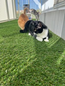 今は少しずつ元気になり、仲良しのお友達と猫庭で遊べるようになりました。下の写真はカフェ内にあるエイズキャリア部屋専用の猫庭で、脱走できないように、柵と天井がついています。まだ神経症状は残っていますし、お薬も毎日朝晩必要です。それでも、お庭に自分で出て日向ぼっこをし、お友達とも戯れあい、お部屋に入りたくなれば、段差を自分で登って室内へ。そのままお気に入りのベッドで眠るという、病気を持っていても、ほのりちゃんなりの幸せを感じてくれているようです。毎日お薬をあげている私は嫌われているようですが…(苦笑)。ほのりちゃんが幸せそうにしている姿を見ると、胸がいっぱいになります。