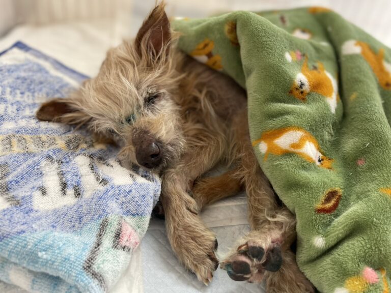 きのこちゃんは、保健所から引き取った当初は脱水がひどくガリガリでした。ぐったりとして、頭を上げることもできませんでした。補液や強制給餌など集中的な医療とケアで無事回復しました」