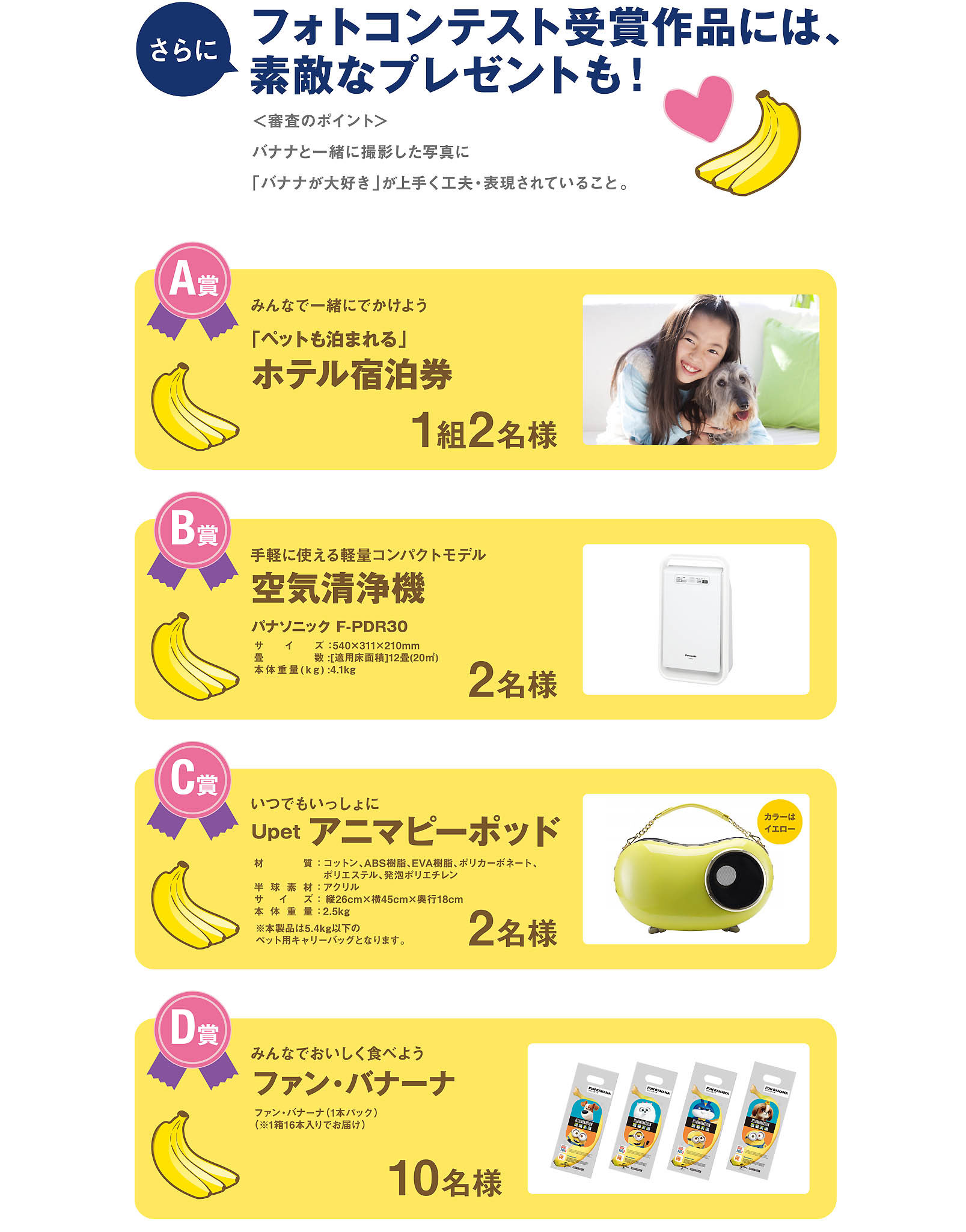 ▶審査のポイント : バナナと一緒に撮影した写真に「バナナが大好き」が上手く工夫・表現されていること。