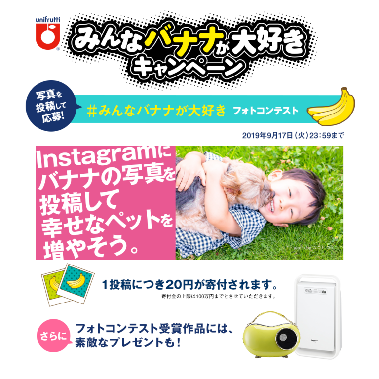 Instagram上でハッシュタグ「#みんなバナナが大好き」と一緒に、バナナの写真を投稿すると、投稿1件につき20円をユニフルーティージャパンより、公益社団法人 アニマル・ドネーションを通じて、動物のために活動する「保護団体」、「伴侶団体」、「啓発団体」へ均等に寄付が分配されます。さらに投稿された写真の中からフォトコンテストを実施し、受賞者には素敵なプレゼントを贈呈されるキャンペーンなのです。