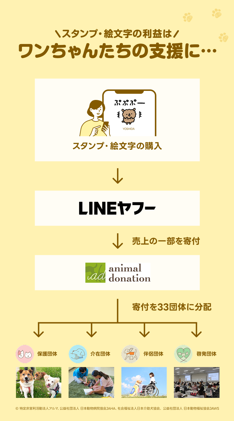キャンペーン対象の“犬スタンプ・絵文字”LINEスタンプを期間中に購入するだけで、売上金額の一部がアニドネを通じて4分野(保護団体・介在団体・伴侶団体・啓発団体)の33団体に届けられます。