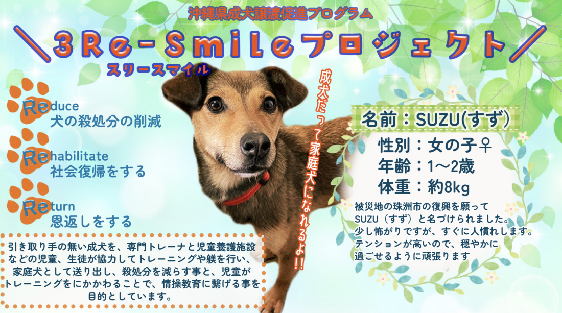 | 活動実績 | ・沖縄県一生うちの子プロジェクト小学校出前授業 ・沖縄県動物愛護推進計画委員、推進員 ・沖縄県成犬譲渡促進事業トレーナー講師 ・沖縄県動物愛護管理センター:譲渡会、適正飼養講習、譲渡会補助、譲渡犬猫追跡調査、飼養相談、しつけ教室、保護譲渡登録団体 ペット防災グッズ展示 ・那覇市環境衛生課:依頼飼育指導、飼育相談、保護譲渡、飼い主飼養相談、那覇市体験学習講師、ふれあい教室、なは動物愛護フェスタドッグラン管理 ・豊見城市防災訓練 ・浦添大公園わんわんゴミ拾い(月一回) |