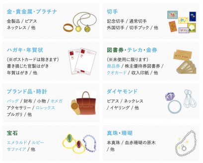 未使用の切手や書き損じはがき、各種商品券、金・貴金属、ブランド食器、骨とう品など、換金の見込めるものを中心に幅広い物品が受付可能