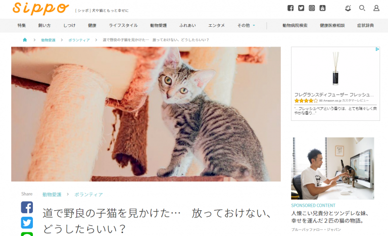 “犬や猫ともっと幸せに”をコンセプトにしたWEBメディア『sippo』(朝日新聞社運営)。代表理事の西平衣里の連載3号目は「道で野良の子猫を見かけた… 放っておけない、どうしたらいい?」の記事です。